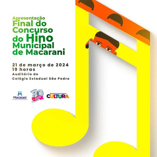 Finalmente depois de uma longa novela iniciada em 2023, teremos hoje o capítulo final da História que levará a escolha definitiva do Hino Oficial de Macarani. Depois de um mês de muitos estudos, etapas realizadas, classificados e eliminados teremos hoje a grande final em apresentação aberta ao público que será realizada no auditório do Colégio Normal São Pedro a partir das 19h (sete da noite).